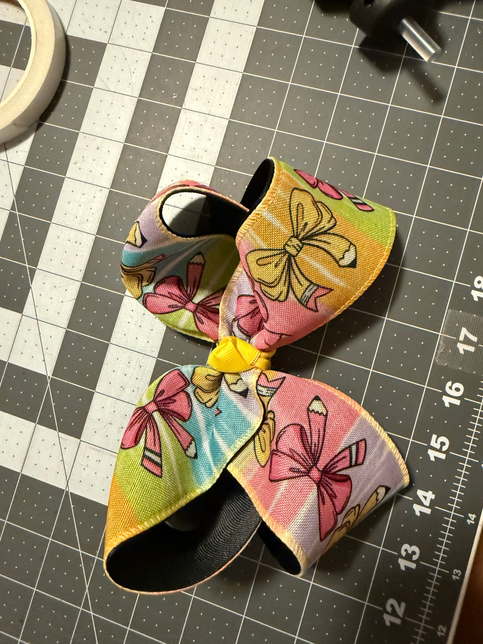 Twisted boutique bow. Approximately 6 inches across. Details: pencil/bows rainbow colors